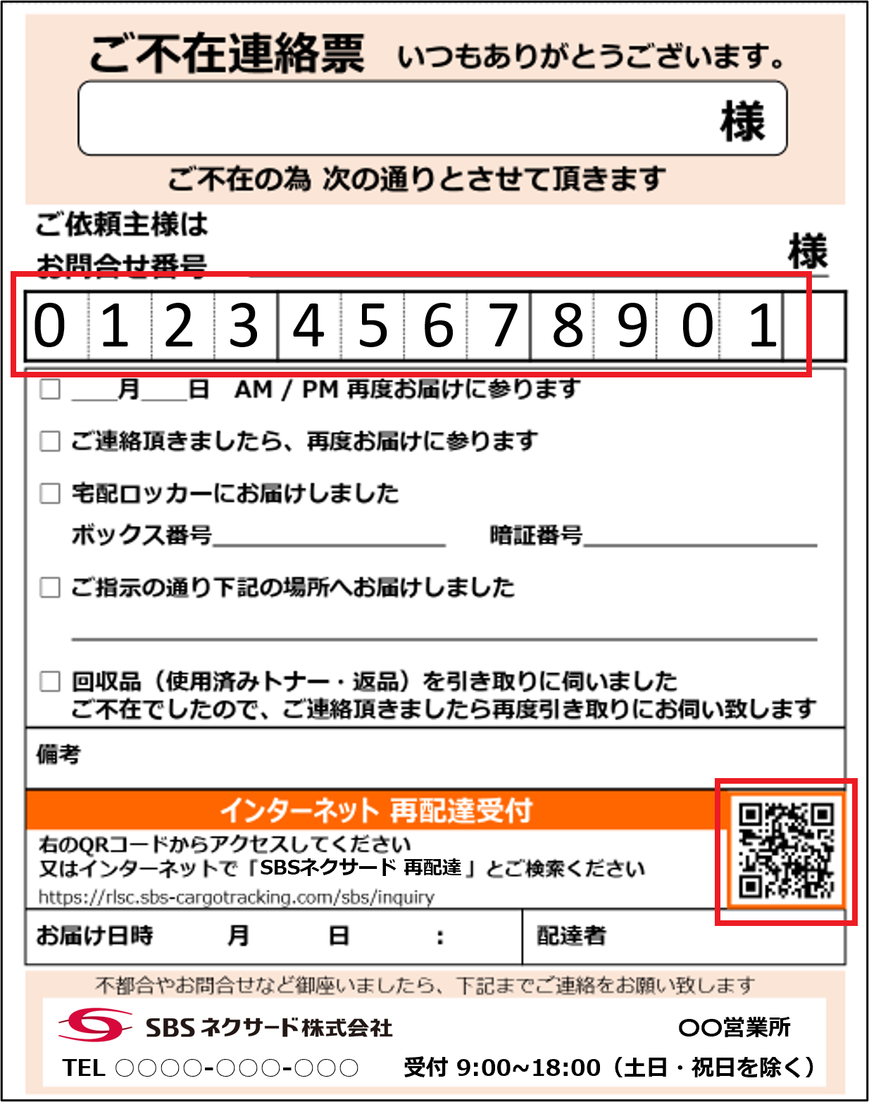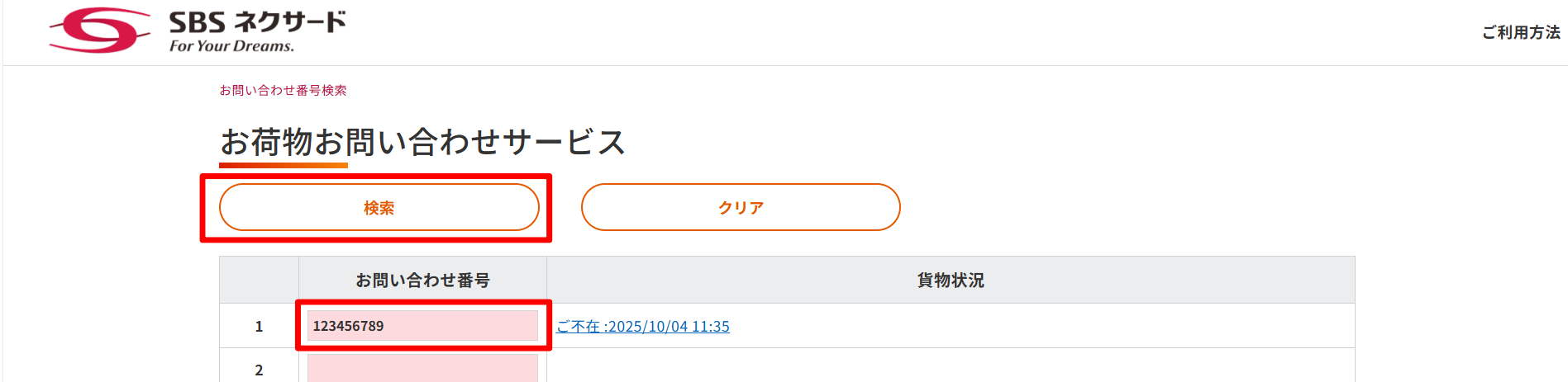 お届けの際にご不在だった場合は、不在票に記載のお問い合わせ番号をご確認ください。 - ご確認頂いた番号を入力し、“検索”をクリックして下さい。