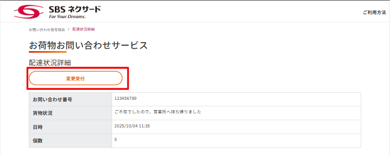 - 配送の変更依頼をする場合、配達状況詳細から“変更受付“をクリックして下さい。