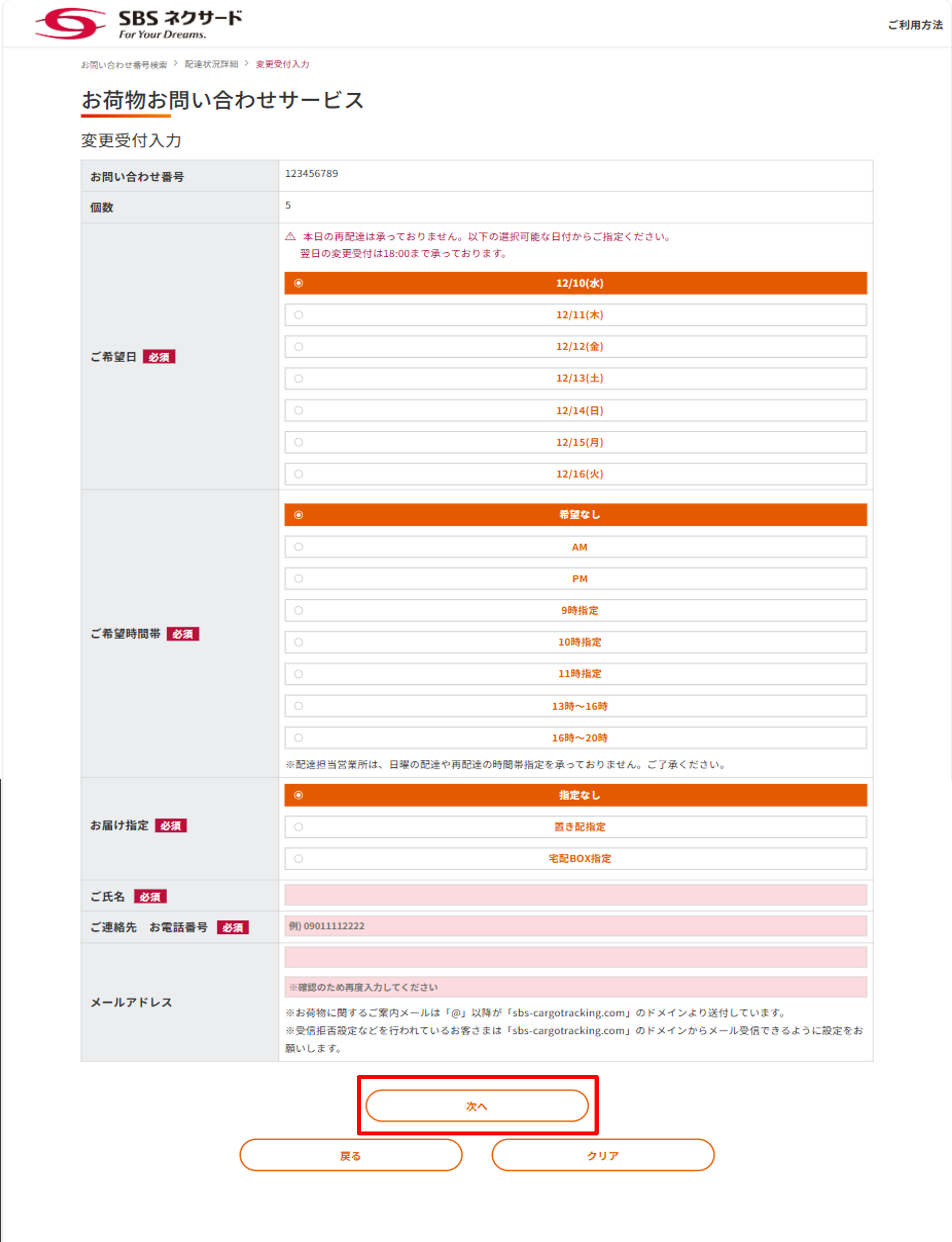 ※入力フォームより取得した情報は、配達日時の変更受付以外の目的での利用は行いません。