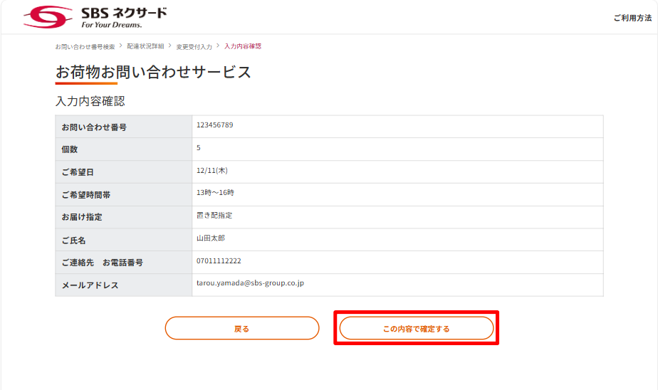 メールアドレスは変更受付完了メールを受け取り希望の方のみ入力をお願い致します。 - 入力内容を確認して問題がなければ”この内容で確定する”をクリックして下さい。